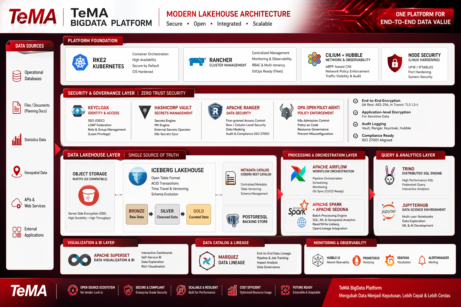 Dalam era ekonomi digital yang semakin kompetitif, kemampuan organisasi dalam mengelola, menganalisis, dan memanfaatkan data menjadi faktor penentu keberhasilan. Menjawab tantangan tersebut, TMA secara resmi menghadirkan TeMA BigData Platform, sebuah solusi modern lakehouse architecture yang dirancang untuk memberikan nilai maksimal dari data secara end-to-end—mulai dari sumber data hingga pengambilan keputusan berbasis insight yang akurat dan real-time.
